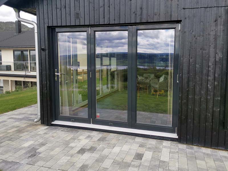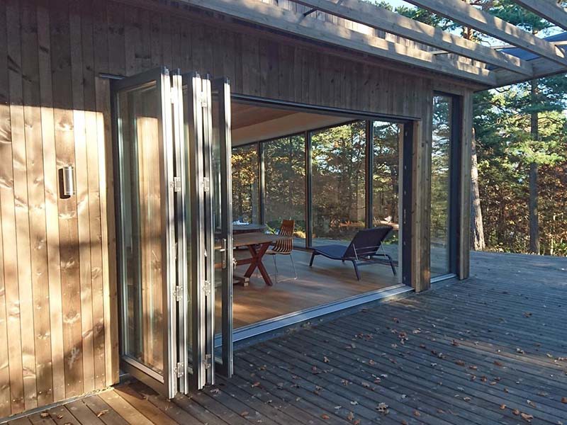 Vikdörrar från Elitfönster med en stomme i trä och väderskydd i form av slitstak aluminium på utsidan. Med en karm i fura och dörrblad i accoya får vikdörrarna en gedigen formstabilitet Du väljer själv om du önskar att öppna vikdörrarna åt höger eller vänster. Oavsett får du alltid en passagedörr för att smidigt kunna gå ut och in de dagar du inte vill öppna hela vikpartiet. Självklart utrustad med endast det bästa i beslagsväg.